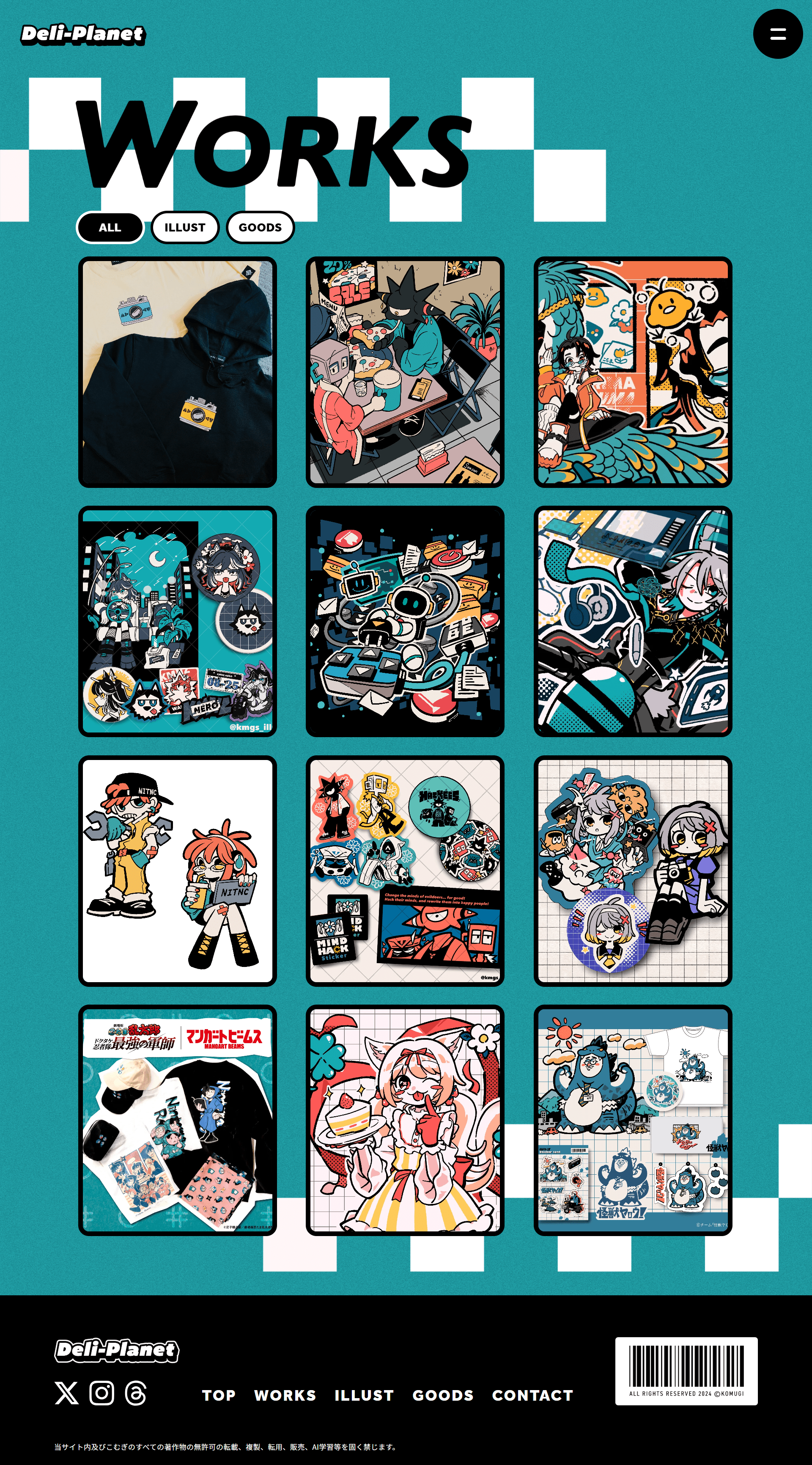 活動内容が分かりやすいように、サイト構成はシンプルかつオーソドックスなものを採用しています。 強みであるグッズ作品をアピールするためにグッズページをイラストページとは別で作成し、実績ページについては グッズのタグ分けができるようにしています。また、ファーストビューやイラストページにはステッカー作品を多用し、 強みと世界観を効果的にアピールしています。