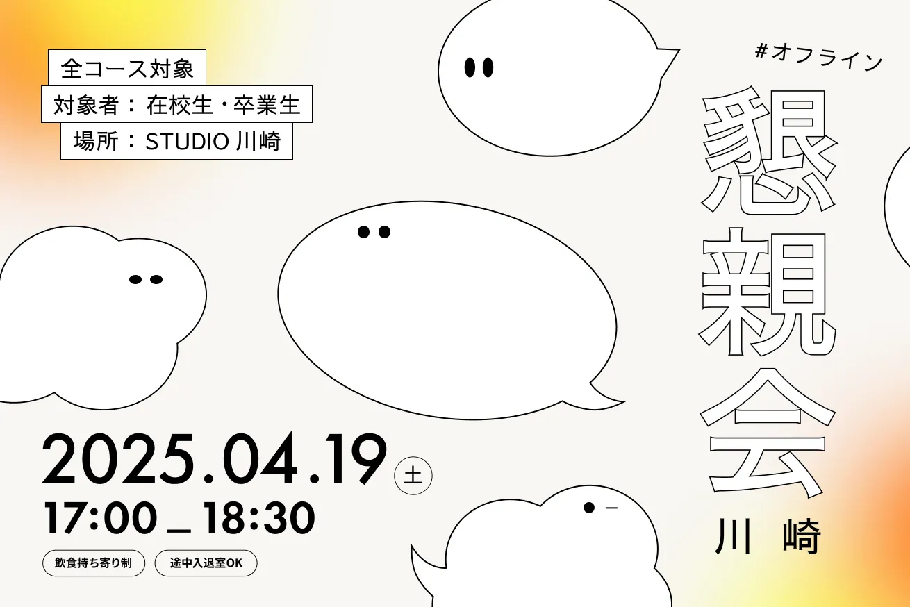 社会人スクールのイベントバナーを制作しました。 オンライン学習中心の受講生たちが気軽に集まれるよう、やわらかく親しみやすいビジュアルで「話しかけやすさ」を演出。吹き出しをキャラクター化し、会話の楽しさと敷居の低さを表現しました。