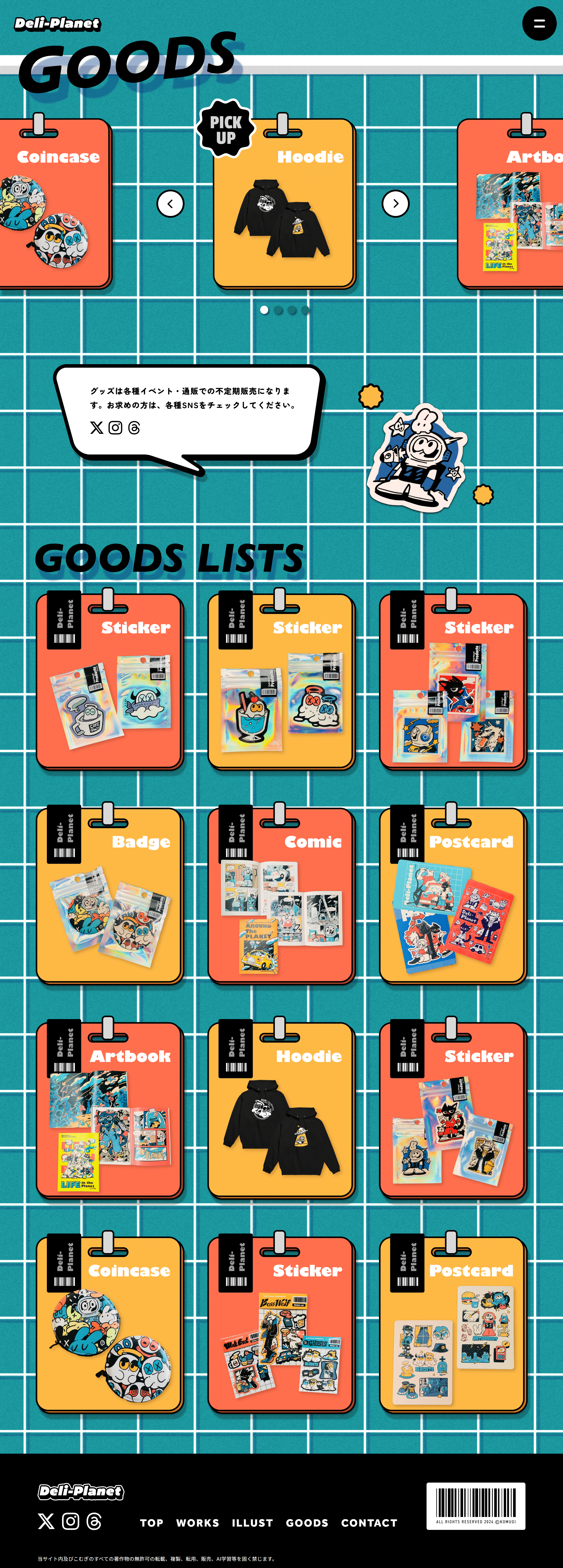 活動内容が分かりやすいように、サイト構成はシンプルかつオーソドックスなものを採用しています。 強みであるグッズ作品をアピールするためにグッズページをイラストページとは別で作成し、実績ページについては グッズのタグ分けができるようにしています。また、ファーストビューやイラストページにはステッカー作品を多用し、 強みと世界観を効果的にアピールしています。