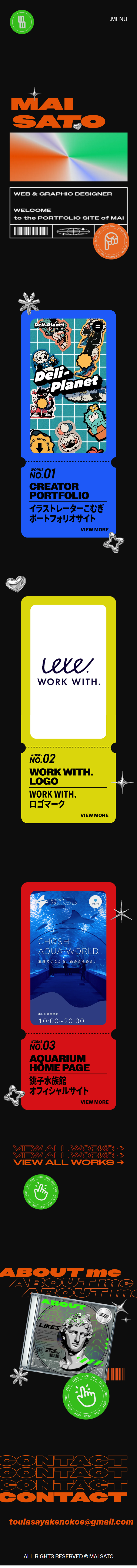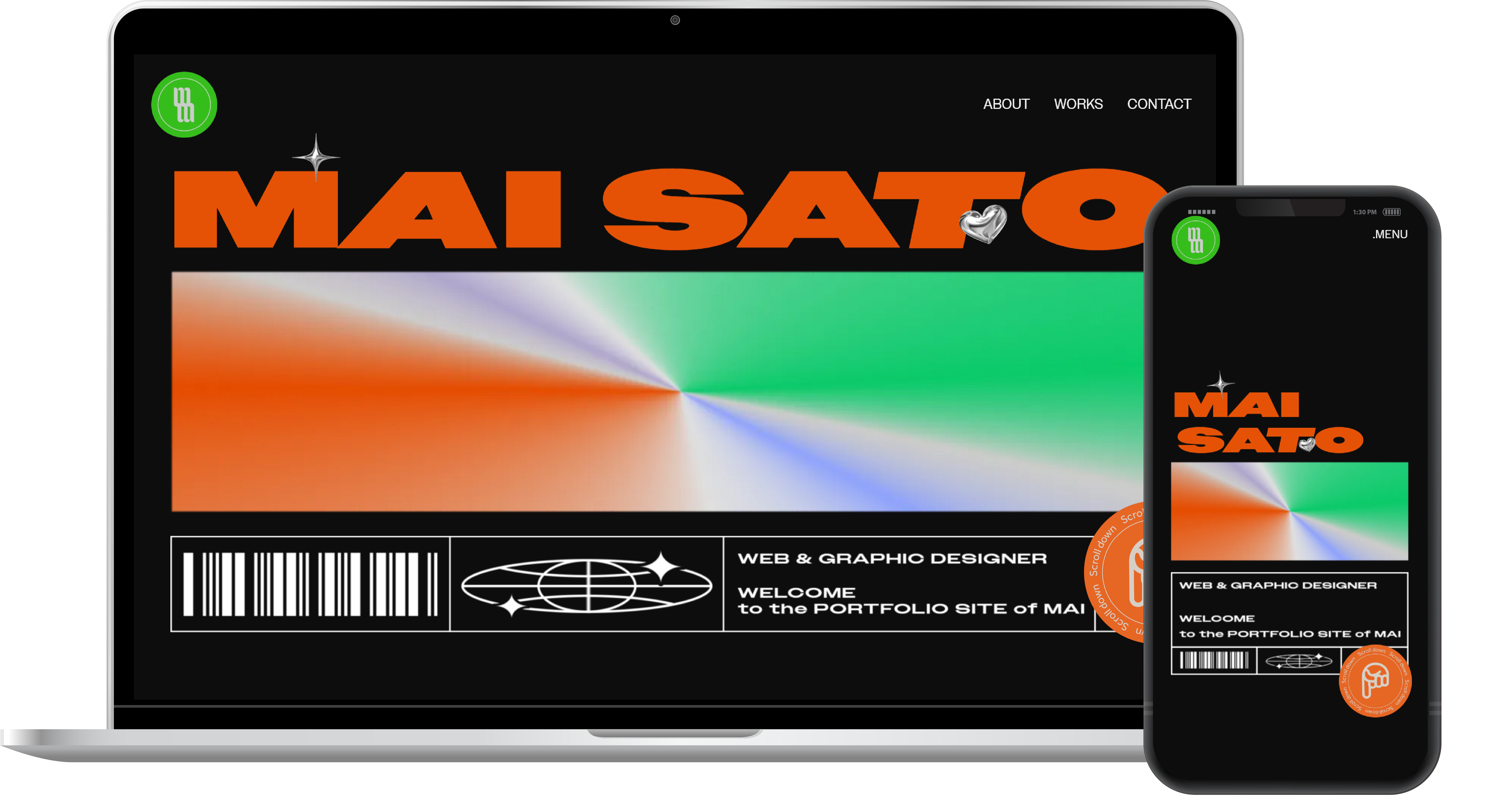 採用担当者の印象に残るよう、「よくあるポートフォリオ」とは一線を画した、自分らしさのある構成とビジュアルを意識して制作しました。 シンプルなレイアウトをベースにしつつ、平体・長体のフォントやノイズグラデーション、Y3K的な光沢モチーフ(銀のハートやバーコード)を組み合わせることで、自分の中にあ「遊び心」や「好き」を表現しています。 また、CDやチケットといったグラフィックモチーフは、「作り手のこだわりを、誰かに伝わるかたちで届けたい」という、デザインに対する自分のスタンスを象徴するものとして使用しました。 全体としては、視覚的なリズムや動きのあるレイアウトで構成し、閲覧者が最後まで心地よく読み進められるよう配慮しています。