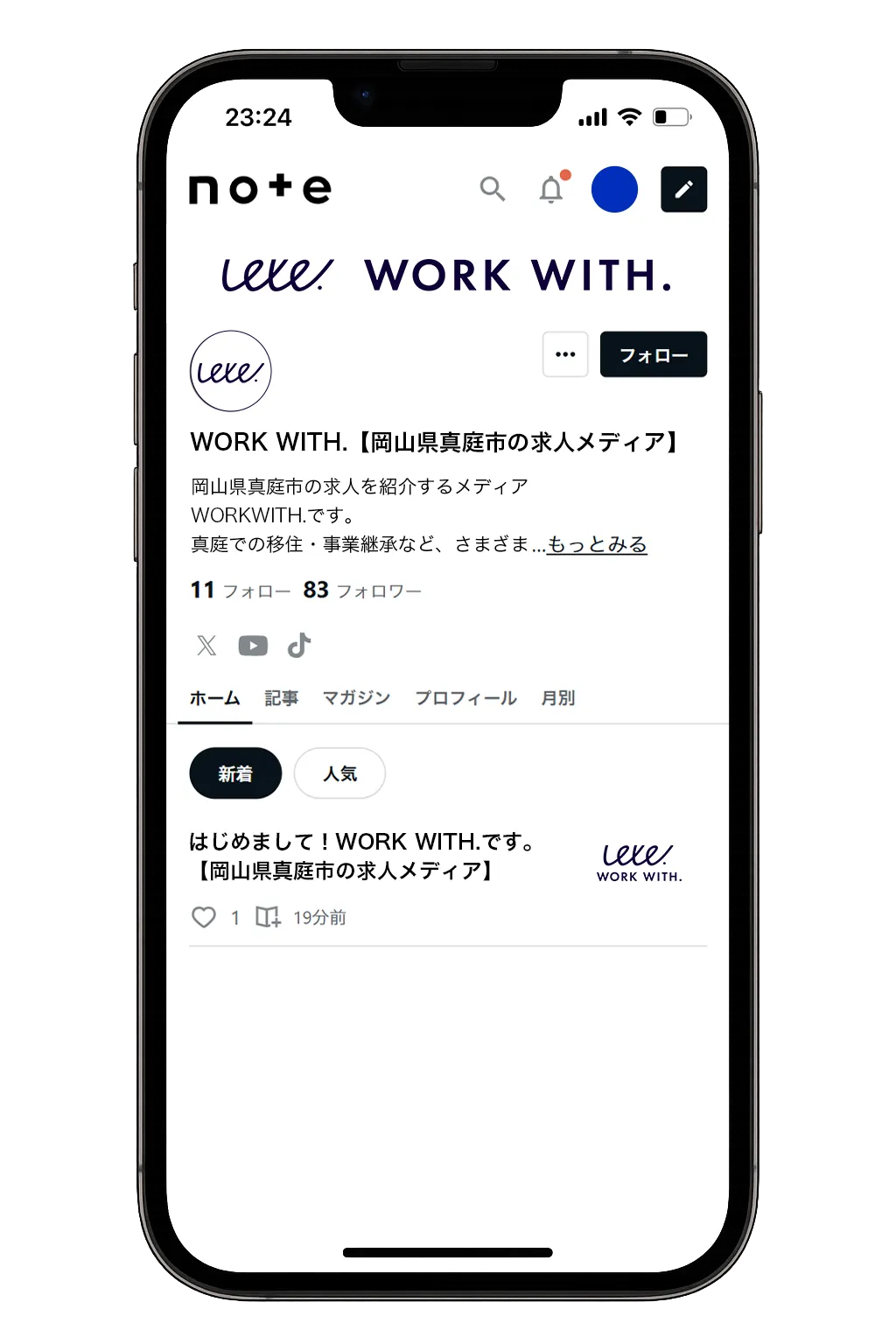真庭市で新たにスタートした人材紹介サービス「WORKWITH.」のロゴを制作。 人と人のつながりを象徴するデザインに、信頼感のある紺と親しみやすいFuturaを使用し、 “暮らしを豊かにする働き方”をビジュアルで表現しました。